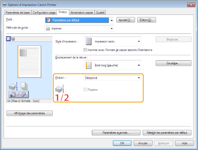Pour savoir comment afficher l'écran du pilote d'imprimante, reportez-vous à la section "Impression" ou "Configuration des réglages d'impression par défaut".