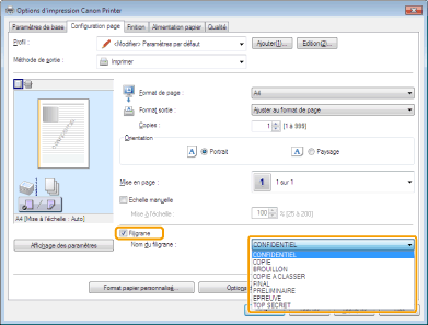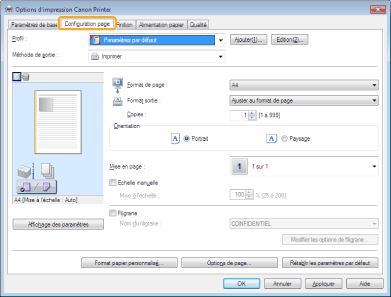 Pour savoir comment afficher l'écran du pilote d'imprimante, reportez-vous à la section "Impression" ou "Configuration des réglages d'impression par défaut".