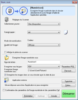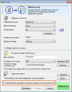 Lors de la numérisation avec [PDF] :Il est uniquement possible de valider l'image numérisée et de spécifier son emplacement d'enregistrement.