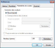Permet d'adapter la couleur à celle du scanner, de l'écran et de l'imprimante couleur. Si cette option est sélectionnée, les boutons de réglage des couleurs sont désactivés dans l'onglet [Mode avancé]. Ce réglage est disponible lorsque la valeur [Mode couleur] sélectionnée est [Couleur], [Couleur (documents)] ou [Niveaux de gris]. |