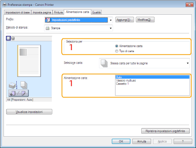Per stampare su un tipo di carta specifico, è necessario specificare l'alimentazione che contiene i fogli o il tipo di carta.