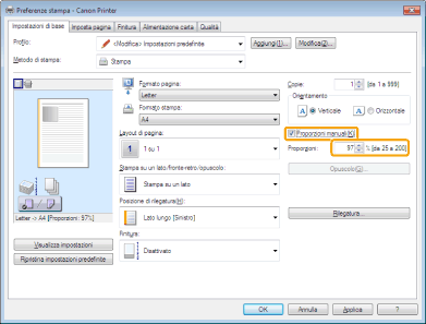 Per impostare manualmente il fattore di ingrandimento o riduzione, selezionare [Proporzioni manuali] e specificare la percentuale in [Proporzioni].