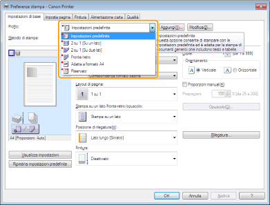 Se i profili non sono selezionabili, aprire la finestra di dialogo delle proprietà della stampante da [Pannello di controllo] e fare clic sulla scheda [Profilo], quindi controllare che siano selezionate le opzioni [Consenti selezione profilo] e [Consenti modifica impostazioni].