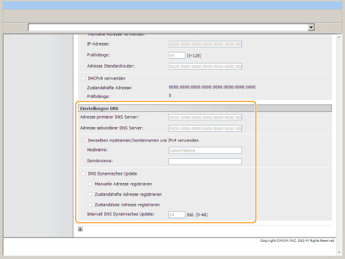 Sie können die IP-Adresse des Geräts ohne Festlegung der Adresse verwenden, indem Sie die Funktion zur dynamischen DNS-Aktualisierung verwenden und [Hostname:] und [Domänname:] mit LPR angeben.