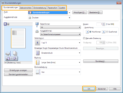 Die Registerkarte [Grundeinstellungen] enthält einige grundlegende Einstellungen für den Treiber. Die Einstellungen, die sich auf der Registerkarte [Grundeinstellungen] finden, können auch auf anderen Registerkarten konfiguriert werden.