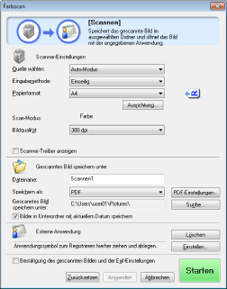 Wenn Sie auf [Starten] klicken, wird das Dialogfeld [ScanGear MF] angezeigt, in dem Sie erweiterte Einstellungen für den Scanvorgang vornehmen können.