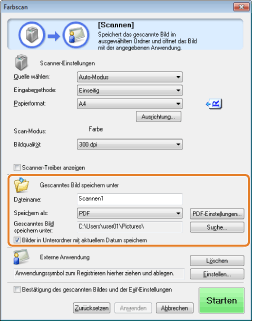 Wenn Sie mit [PDF] scannen:Sie können nur das gescannte Bild bestätigen und den Speicherort des Bildes angeben.