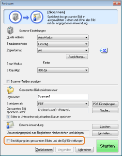 Wenn das Kontrollkästchen aktiviert wird, werden für den Scan dieselben Einstellungen wie für den letzten Scanvorgang angegeben. |