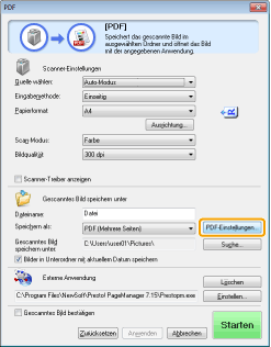 Geben Sie die erforderlichen Einstellungen nach Bedarf an, und klicken Sie auf [PDF-Einstellungen].