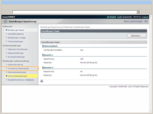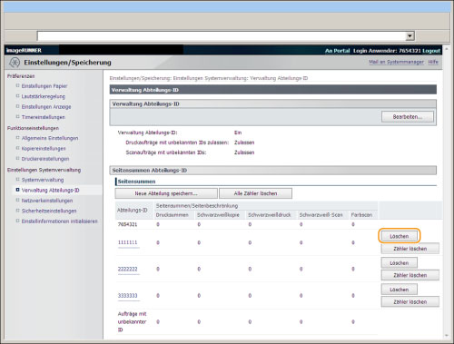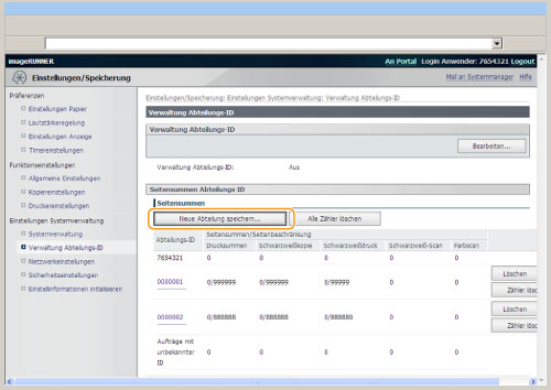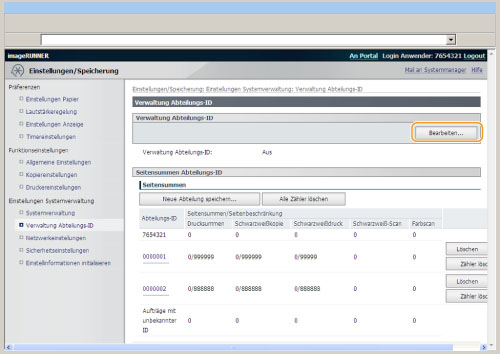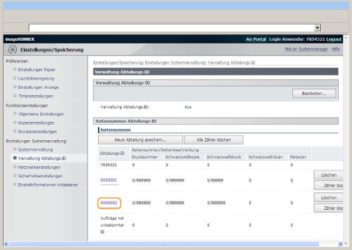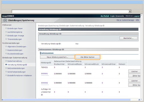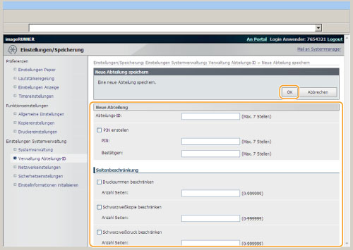 Damit können Sie die Funktion Verwaltung Abteilungs-ID verwenden. Durch Aktivieren des Kontrollkästchens muss vor der Verwendung der Kopierfunktion oder anderer Funktionen des Systems eine Abteilungs-ID eingegeben werden. Sie können auch Zählerstände abrufen und die maximale Anzahl der Seiten, die pro Abteilung gedruckt werden dürfen, festlegen.