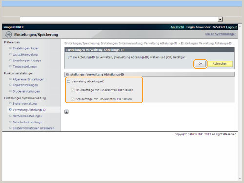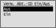 ], um <Verwaltung Abteilungs-ID Ein/Aus> hervorzuheben, und drücken Sie dann [OK].