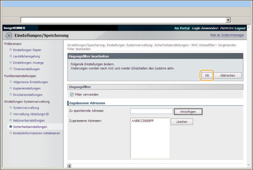 Klicken Sie für <Einstellungen Systemverwaltung> auf [Sicherheitseinstellungen] und dann auf [MAC-Adressfilter].
