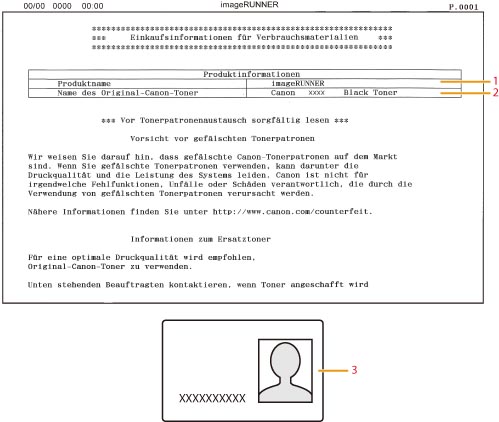 Sie können Bezugsinformationen für Verbrauchsmaterial ausdrucken. Die folgenden Elemente werden gedruckt: