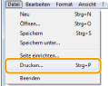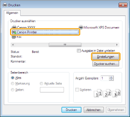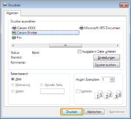 Geräte] -> verwendeter Drucker -> [Drucken]. Beim Drucken mit dieser Methode können nur einige Druckfunktionen festgelegt werden. |