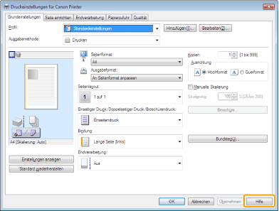 Sie können die Online-Hilfe durch Klicken auf [Hilfe] auf dem Druckertreiber-Bildschirm anzeigen.
