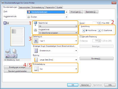 Hier können Sie das Papierformat wählen, das vom Drucker ausgegeben werden soll (vgl. "Skalieren von Dokumenten").