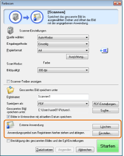 Diese Schaltfläche wird anstelle von [Speichern] angezeigt, wenn in der Einstellung [E-Mail-Programm] oder [Externe Anwendung] eine Anwendung angegeben wurde. Sie können die gescannten Bilder an die Anwendung weiterleiten.