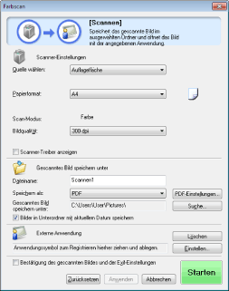 Wenn Sie auf [Starten] klicken, wird das Dialogfeld [ScanGear MF] angezeigt, in dem Sie erweiterte Einstellungen für den Scanvorgang vornehmen können.