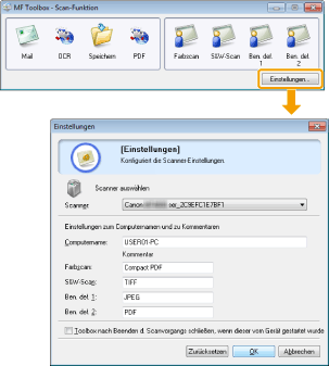 Wenn das Kontrollkästchen aktiviert wird, wird der MF Toolbox-Bildschirm geschlossen, wenn der Scanvorgang über die Tasten des Bedienfelds abgeschlossen ist.