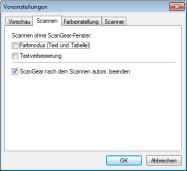 Wenn dieses Element ausgewählt wird, wird das Dialogfeld [ScanGear MF] nach dem Scanvorgang automatisch geschlossen. Abhängig von der Anwendung wird ScanGear MF unabhängig von dieser Einstellung nach dem Scanvorgang automatisch geschlossen.