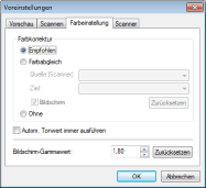 Passt die Farbe an die Farbausgabe von Scanner, Monitor und Farbdrucker an. Wenn dieses Element ausgewählt wird, sind die Schaltflächen für die Farbeinstellung auf der Registerkarte [Erweiterter Modus] deaktiviert. Diese Einstellung ist verfügbar, wenn für [Farbmodus] die Option [Farbe], [Farbe (Dokumente)] oder [Graustufen] ausgewählt wurde. |