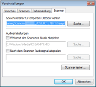 Während des Scanvorgangs wird Musik abgespielt. Klicken Sie auf [Suche], und geben Sie eine Audiodatei an. [Nach dem Scannen Audiosignal abspielen]