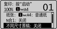 如果“不同尺寸原稿”与“单面到双面”组合使用,且双面复印件的正反面所对应的原稿尺寸不同,则会以各自的尺寸分别输出单面复印件。