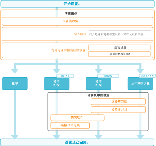 要使用本机的功能(复印、打印、扫描、远程用户界面),请按以下方式设置本机。