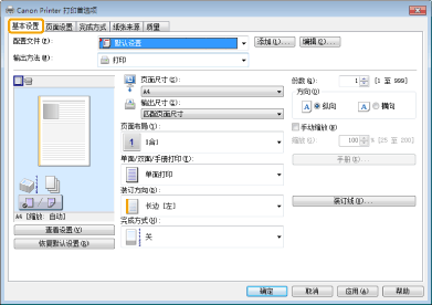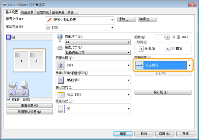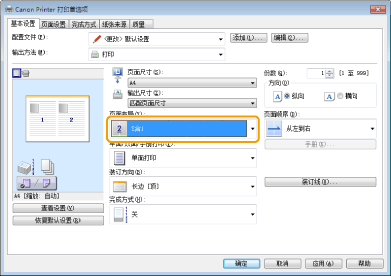 如果无法从[页面布局]选择选项,显示[设备设置]选项卡,然后从[在主机后台打印]选择[自动]或[启用]。有关如何显示[设备设置]选项卡的说明,请参阅在线帮助。(请参阅“查看在线帮助”)