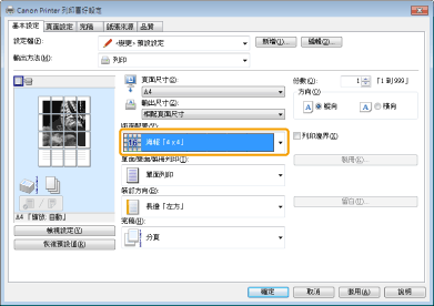可以在下列情況下選擇 [海報列印]:從 [完稿] 標籤頁中的 [列印樣式] 選擇了 [單面列印]。有關詳細資訊,請參閱「單面列印和雙面列印」。