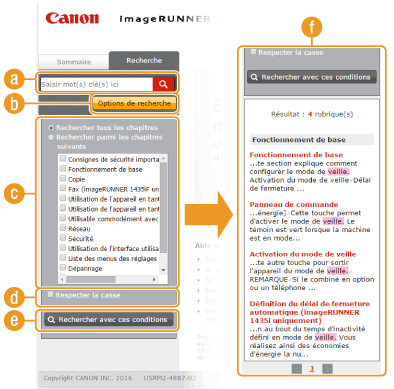 Affiche les résultats de la recherche associés aux pages contenant les mots clés que vous avez stipulés. Dans la liste des résultats, identifiez la page que vous recherchez et cliquez sur le titre de rubrique de la page en question. Si les résultats occupent plus d'une page, cliquez sur