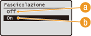 Quando si preparano più copie di documenti con più pagine, impostare <Fascicolazione> su <On> per fascicolare le copie in ordine sequenziale di pagina. Questa funzione è utile quando si preparano documenti da distribuire durante meeting o presentazioni.