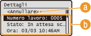 Sono visualizzati il numero di documento di invio, le impostazioni e altri dettagli. Se si desidera solo verificare i dettagli senza annullare, premere
