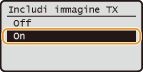 Quando si seleziona <On> o <Solo se errore>, una parte di un documento fax può essere inclusa nel rapporto. Impostare <Includi immagine TX> su <On> e premere  .