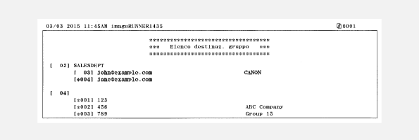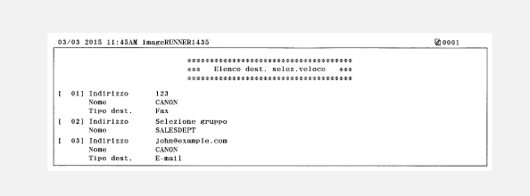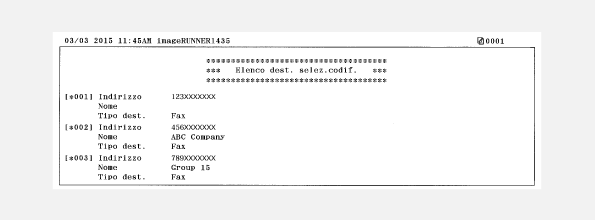 È possibile stampare un elenco per controllare i dettagli delle destinazioni registrate nella Rubrica. È possibile stampare separatamente gli elenchi per i tipi di registrazione <Selezione codificata>, <Selezione veloce> e <Gruppo>.