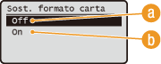 <Formato carta predef.> e <Tipo di carta predef.> non possono essere specificati separatamente. Specificare il formato nella schermata <Formato carta predef.>, quindi il tipo di carta nella schermata <Tipo di carta predef.>.