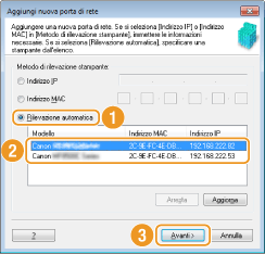Fare clic su [Rilevamento automatico], selezionare la macchina quando viene rilevata e fare clic su [Avanti].