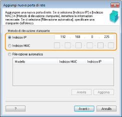 Se la macchina non viene rilevata Fare clic su [Aggiorna]. Se il problema persiste, fare clic su [Indirizzo IP] o [Indirizzo MAC], immettere l'indirizzo IP o l'indirizzo MAC della macchina Visualizzazione delle impostazioni di rete, quindi fare clic su [Avanti].