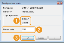 Fare clic sul pulsante di opzione [LPR] o [RAW] in [Tipo di protocollo], cambiare il numero nella casella di testo [Numero porta] in base alle esigenze, quindi fare clic su [OK].