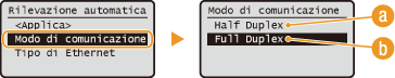 selezionare <Half Duplex> o <Full Duplex> .![]() <Half Duplex>Invia e riceve dati di comunicazione alternativamente. Selezionare quando la macchina è collegata a un dispositivo di rete che utilizza half-duplex.