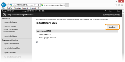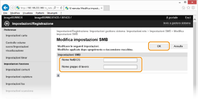 Server Message Block (SMB) è un protocollo per la condivisione di risorse, come file e stampanti, con più di un dispositivo in una rete. La macchina utilizza SMB per archiviare documenti digitalizzati in una cartella condivisa. A seconda della rete, sarà necessario impostare il nome NetBIOS e il nome del gruppo di lavoro.