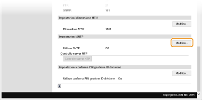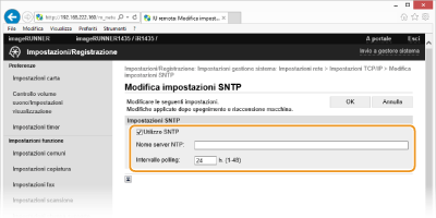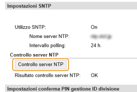 Verifica della comunicazione con il server NTP/SNTPÈ possibile verificare se la macchina comunica con il server di riferimento orario registrato tramite SNTP. Passare a [Impostazioni/Registrazione]
