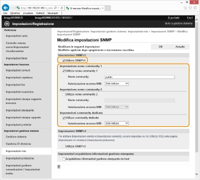 Se entrambe le versioni di SNMP sono abilitate, si consiglia di impostare le autorizzazioni di accesso MIB in SNMPv1 su [Solo lettura]. Le autorizzazioni di accesso MIB possono essere impostate indipendentemente in SNMPv1 e SNMPv3 (e per ogni ciascun utente in SNMPv3). Selezionando [Lettura/Scrittura] (autorizzazione di accesso completa) in SNMPv1 si annullano le solide caratteristiche di sicurezza che contraddistinguono SNMPv3 poiché la maggior parte delle impostazioni della macchina possono quindi essere controllate con SNMPv1.