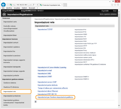 È possibile facilitare la raccolta e la gestione di varie informazioni sui dispositivi di rete implementando un software di gestione dei dispositivi, ad esempio iW Management Console*, sulla rete. Informazioni come impostazioni di dispositivo, Rubrica e registri di errore vengono recuperati e distribuiti attraverso il server. Se la macchina è collegata a questo tipo di rete, il software di gestione dispositivi cerca la macchina nella rete utilizzando protocolli come Service Location Protocol (SLP) per raccogliere informazioni dalla macchina. In questa sezione vengono descritte le procedure delle impostazioni SLP e delle impostazioni per la comunicazione tra la macchina e i plug-in di iW Management Console. Queste impostazioni SLP possono essere specificate attraverso la IU remota.