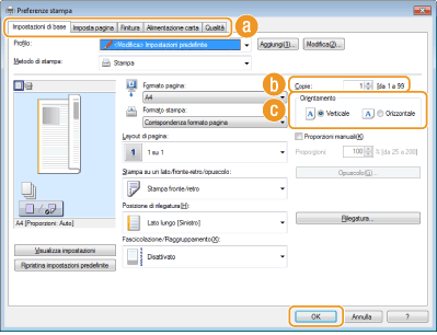Specificare le impostazioni di stampa, ad esempio numero di copie e orientamento, quindi fare clic su [OK].