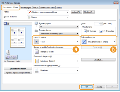 È possibile stampare più pagine su un singolo foglio. Ad esempio, è possibile stampare da quattro a nove pagine su un foglio con l'opzione [4 su 1] o [9 su 1]. Utilizzare questa funzione per risparmiare carta o visualizzare il documento come miniatura.