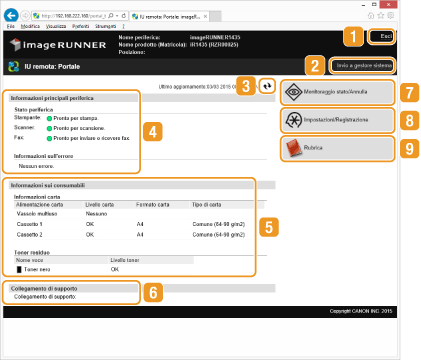 Visualizza lo stato corrente della macchina e le informazioni di errore. Se si sono verificati errori, viene visualizzato il collegamento alla pagina [Informazioni sull'errore].