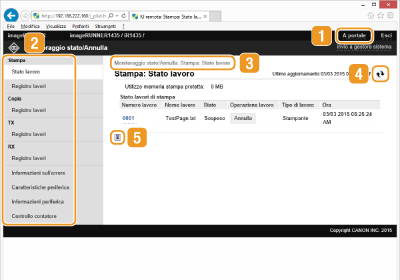 Visualizza lo stato dei documenti di stampa correnti e la cronologia di stampa, copia, invio e documenti ricevuti. È inoltre possibile controllare lo stato della macchina.