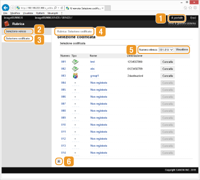 Visualizza i numeri a selezione codificata e l'elenco dei tasti di selezione veloce registrati nella Rubrica. Se è stato effettuato l'accesso in modalità Gestore sistema, è inoltre possibile registrare o modificare la rubrica.
