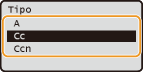 . Utilizzare la Rubrica o un server LDAP per le destinazioni <A>. Per specificare le destinazioni come <Cc> e <Ccn>, è necessario utilizzare la Rubrica.